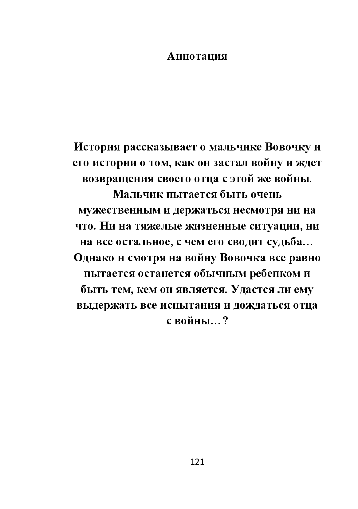 История рассказывает о мальчике Вовочку и его истории о том, как он застал войну и ждет возвращения своего отца с этой же войны. Мальчик пытается быть очень мужественным и держаться не смотря ни на что. Ни на тяжелые жизненные ситуации, ни на все остальное, с чем его сводит судьба… Однако н смотря на войну Вовочка все равно пытается останется обычным ребенком и быть тем, кем он является. Удастся ли ему выдержать все испытания и дождаться отца с войны…?