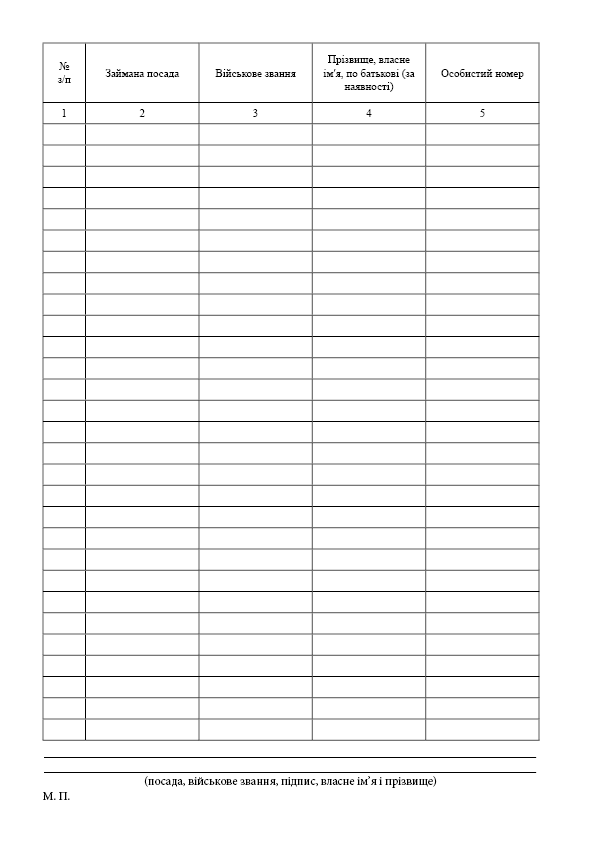 At printto.ua, you can order the magazine: Name list of personnel to be transported. If the magazine you need is not available in the Printto.ua Market, send us an e-mail at info@printto.ua, and we will definitely contact you. More details: Name list of personnel to be transported. Appendix 58 to the Instruction on organization of personnel accounting composition in the system of the Ministry of Defense of Ukraine (item 11 of chapter XII) Portrait orientation. Format: A4 In stock, delivery time 1-2 working days.