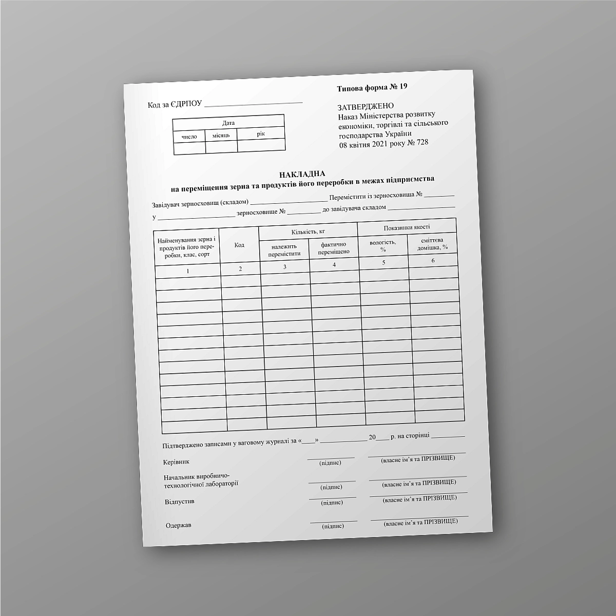 Накладна на переміщення зерна та продуктів його переробки в межах підприємства.