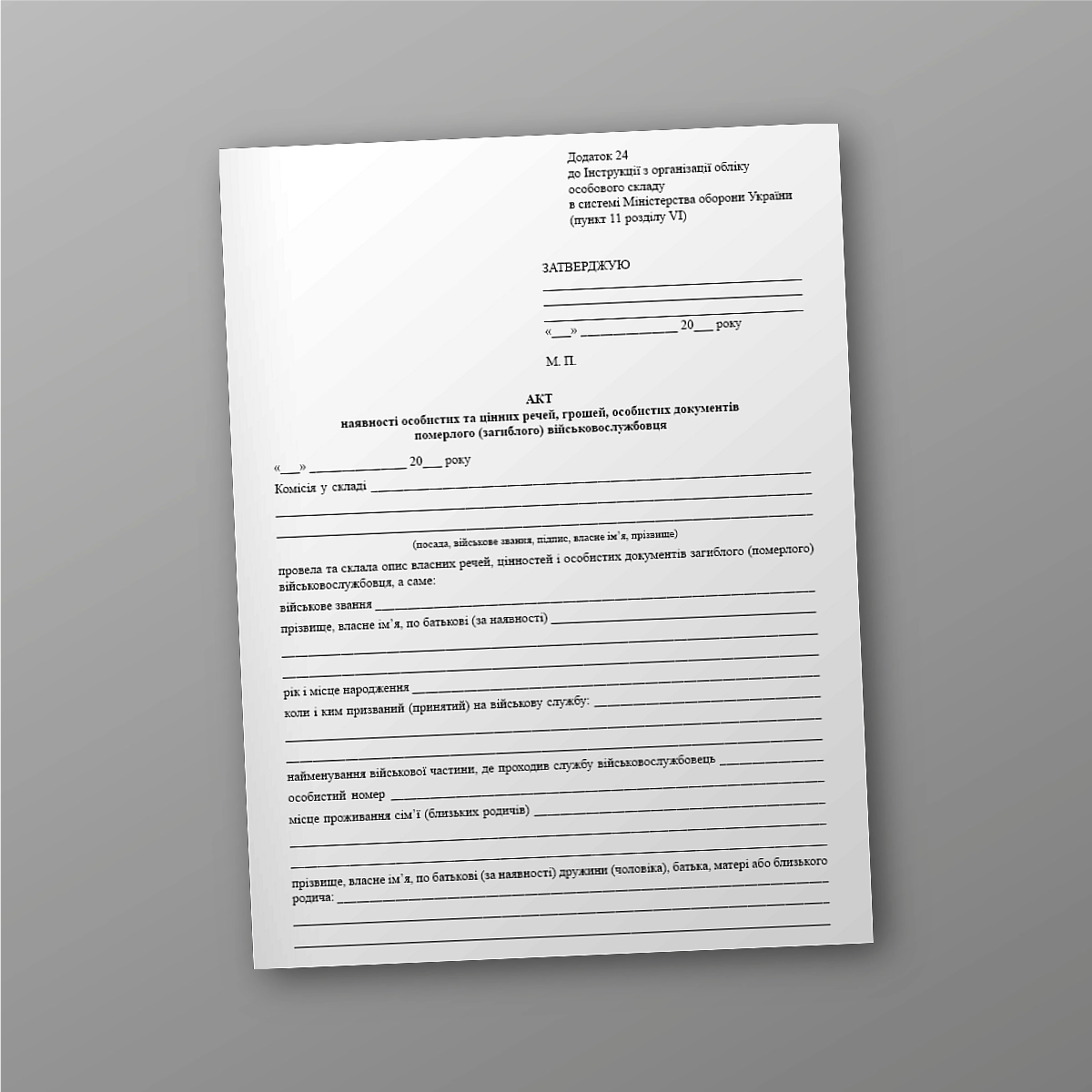 В printto.ua Вы можете заказать: Акт наличия личных и ценных вещей, денег, личных документов умершего (погибшего) военнослужащего.