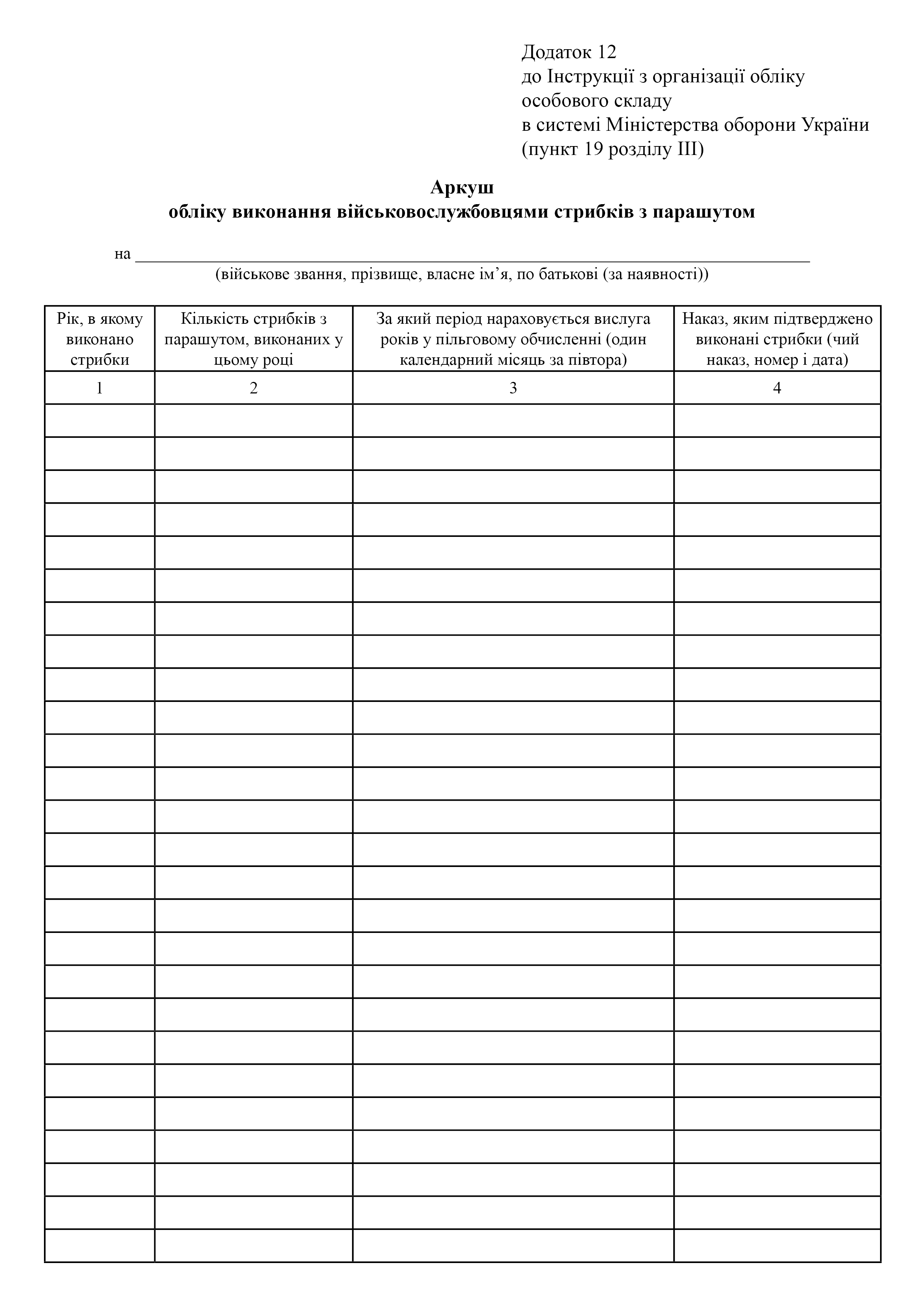Аркуш обліку виконання військовослужбовцями стрибків з парашутом.